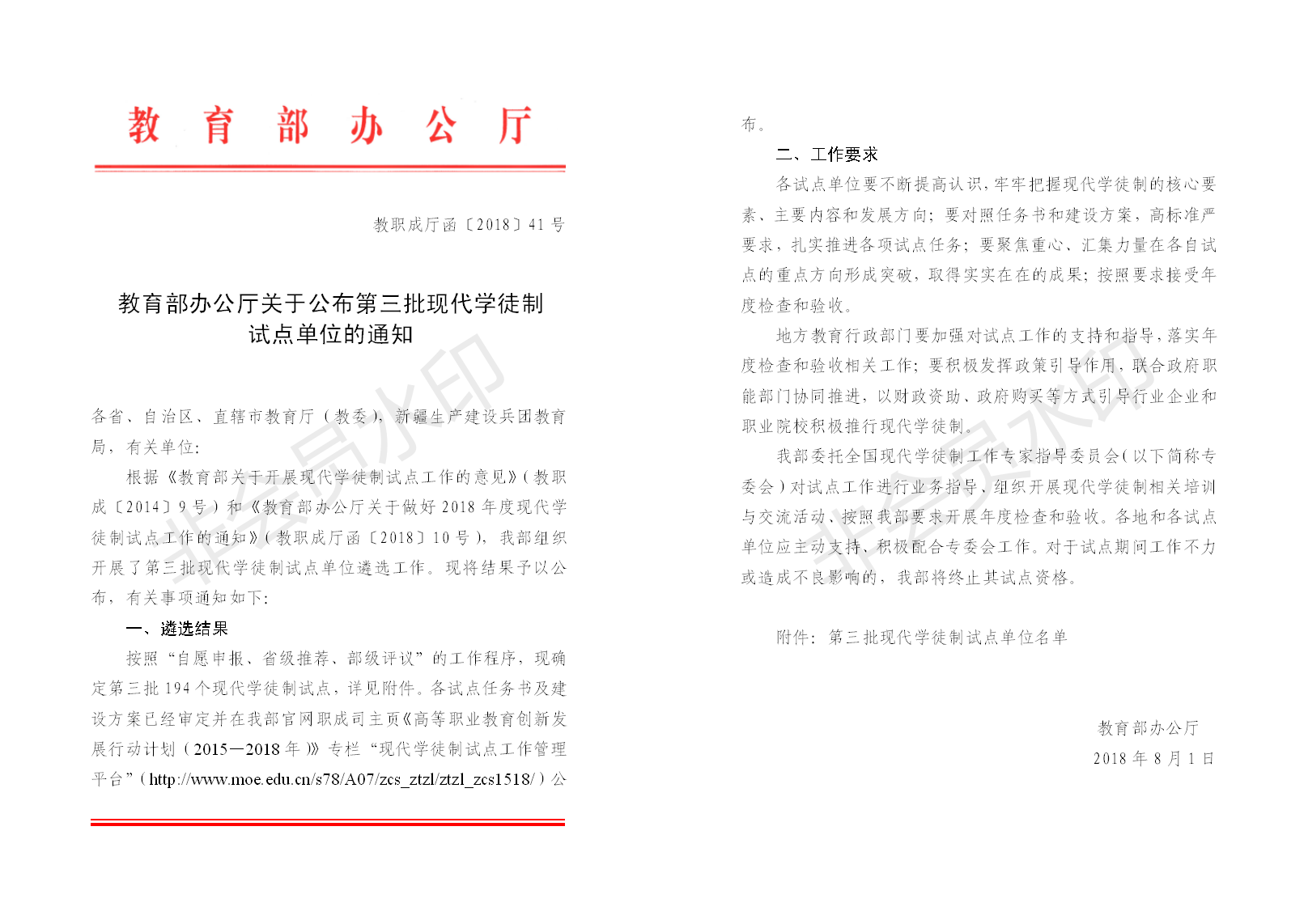 近日,教育部办公厅发布《关于公布第三批现代学徒制试点单位的通知》(教职成厅函〔2018〕41号),学院成功入选教育部第三批现代学徒制试点单位。