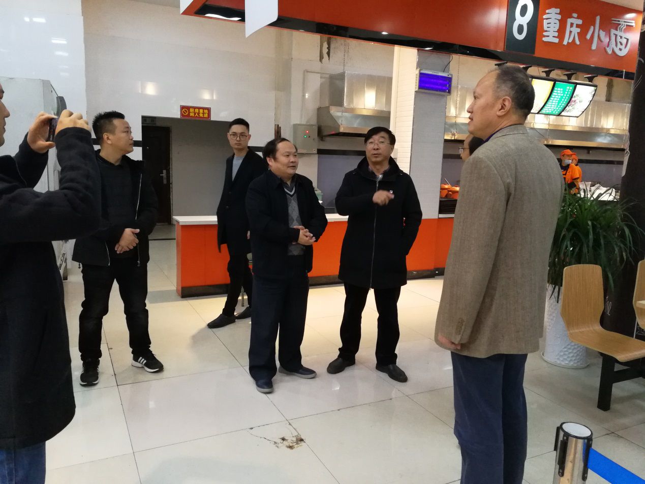交流中,梁先勇同志对彭著久一行的到来表示热烈欢迎,石伟同志就学院后勤管理相关工作进行了详细介绍。双方围绕食堂现行管理体制、运行机制、食堂内部设施及餐饮文化建设等方面的工作情况进行了深入交流,并实地参观了学生二食堂及教职工餐厅。