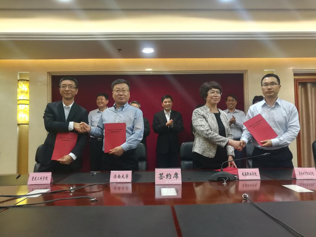 协作框架协议签约仪式在市教委二楼会议室举行。学院院长江洪与威海职业学院副院长王祖莉分别代表双方签订东西协作框架协议。重庆市委教育工委书记、教委主任舒立春,山东省委教育工委委员、教育厅副厅长王坦见证签约。