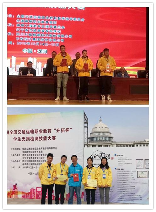 建筑工程系18建管0031班检测一组向宇峰、张明静在谭兴斌、徐永秋、韩永光老师的指导下参加了2019年全国第二届交通运输职业教育“升拓杯”学生无损检测技能大赛,并以优异的成绩取得立柱埋置深度测定二等奖。