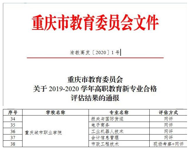1月15日,从《重庆市教育委员会关于2019-2020学年高职教育新专业合格评估结果的通报》(渝教高发〔2020〕1号)获悉,木瓜视频 工业机器人技术专业、市政工程技术专业、报关与国际货运专业、电子商务专业、会计信息管理专业5个专业顺利通过新专业合格评估。