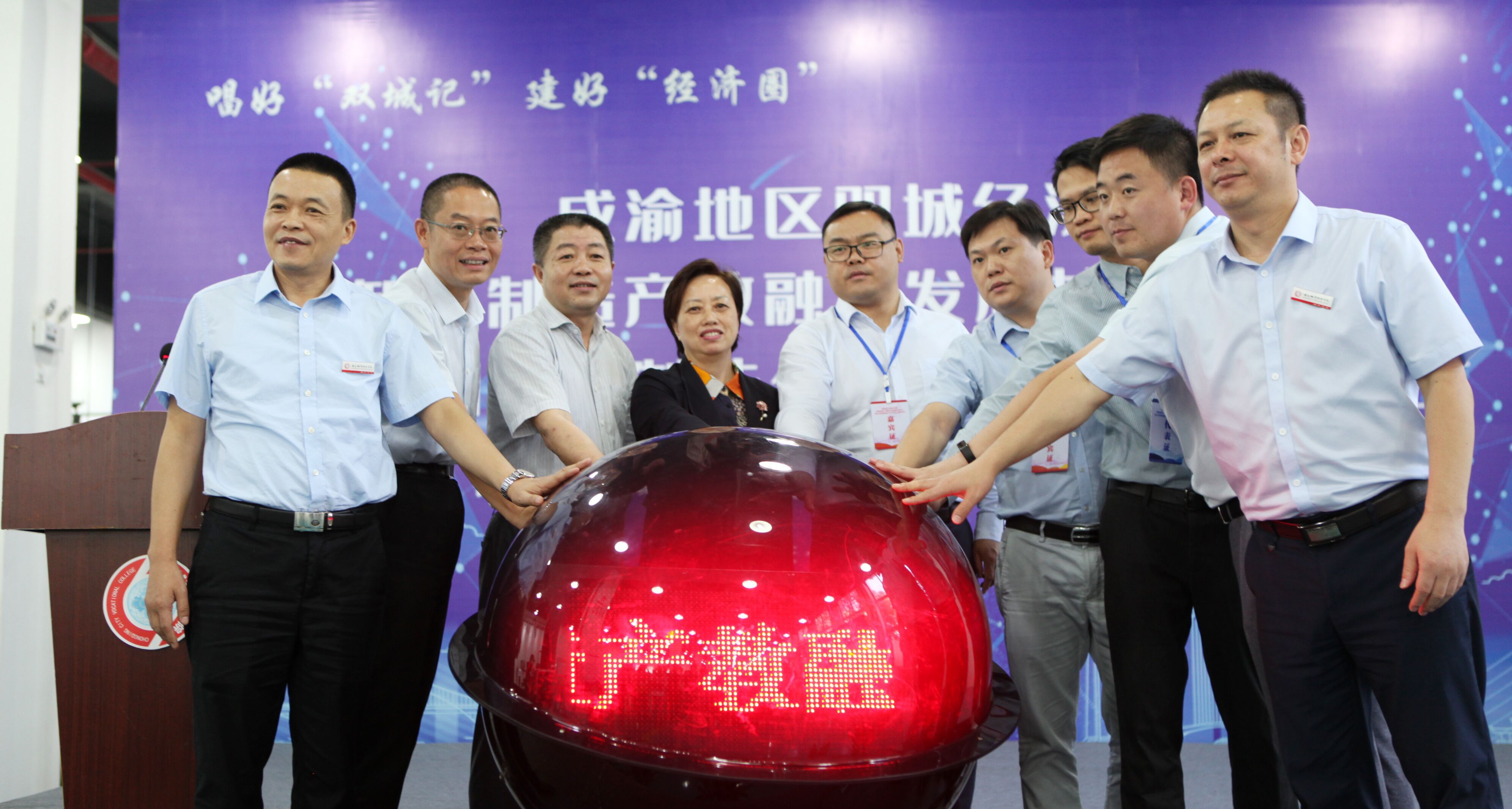 党委书记刘波和任伯平副区长等相关领导一道点亮水晶球,标志着成渝双城经济圈智能制造产教融合发展共同体正式成立。大会还同时见证了永川区智能制造公共实训中心揭牌。
