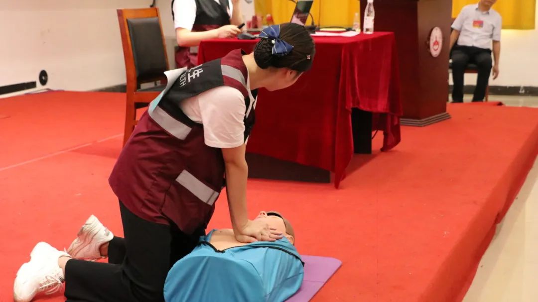 永川区人民医院院长吴修英介绍了区人民医院作为重庆市公共卫生应急技能培训基地建设情况。并通过理论知识讲解、现场演示、一对一指导的方式给大家培训心肺复苏术、气道异物梗阻解除术、止血、包扎伤口等基本急救技能。